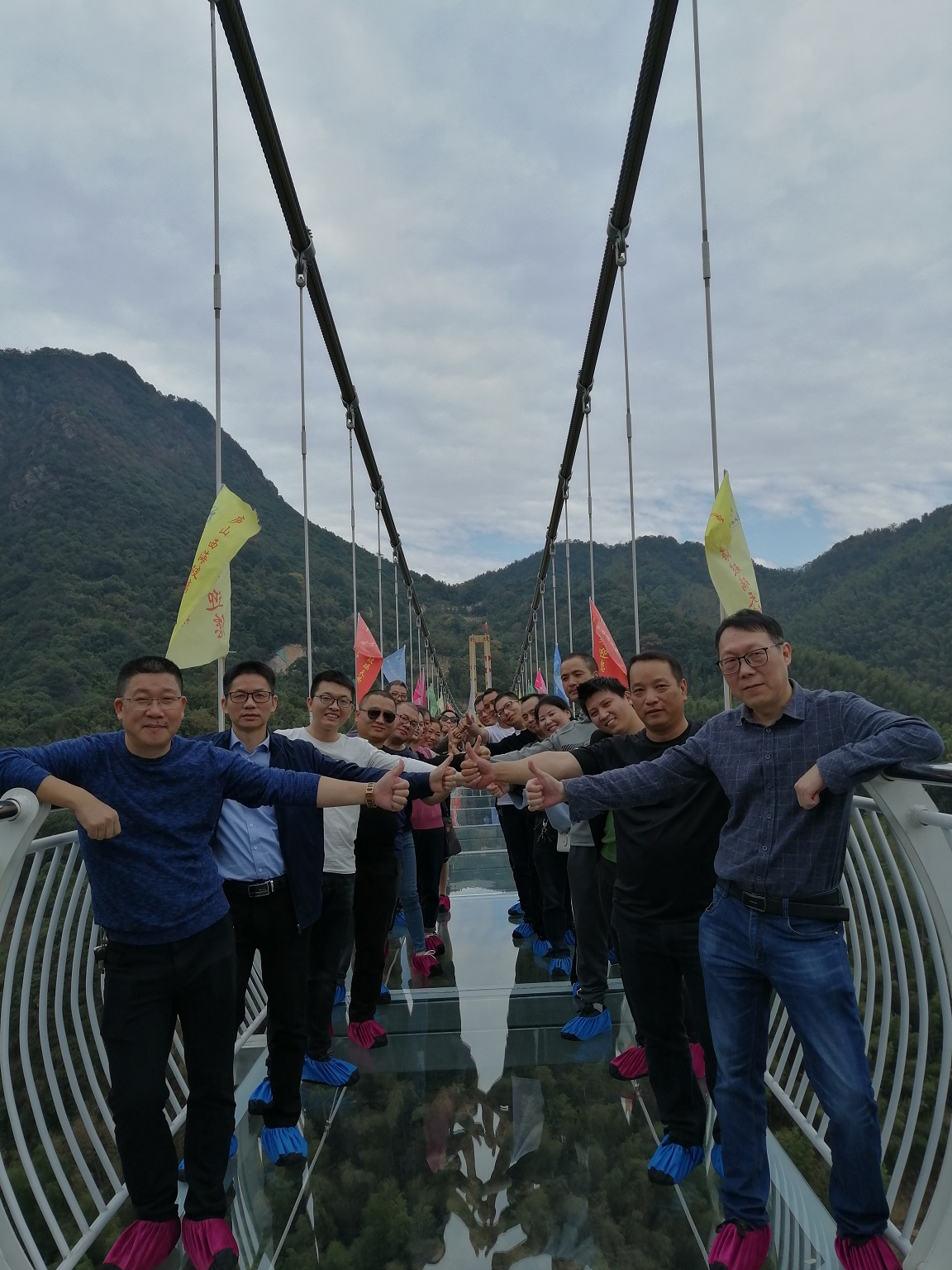 16日一早陽光明媚,在一路的歡歌笑語中,大家首先來到了“人在橋上走,景在底下游”的廬山西海9D玻璃橋。 此橋凌駕于峰巒疊嶂的兩山之間,全程用透明玻璃構成,全長398米最高落差108米寬2米,遠遠望之仿佛隱形于叢林之中,站在玻璃天橋上有步入云端的感覺,玻璃橋中段還有震撼9D效果,輕輕一踩玻璃便在腳下爆碎蔓延,逼真刺激的破碎聲音咔咔咔地在耳邊響起。這使得團隊里多名恐高隊友,一開始都覺得這是不可能跨越的鴻溝,紛紛打起退堂鼓。但在同事們的再三鼓勵下,最終克服恐懼,戰勝自己!通過玻璃棧道后大家回程嘗試了廬山西海9D玻璃滑道,全長518米的雙道雙滑玻璃滑道,不僅周圍風光一覽無余,更切實感受了一把速度與激情。