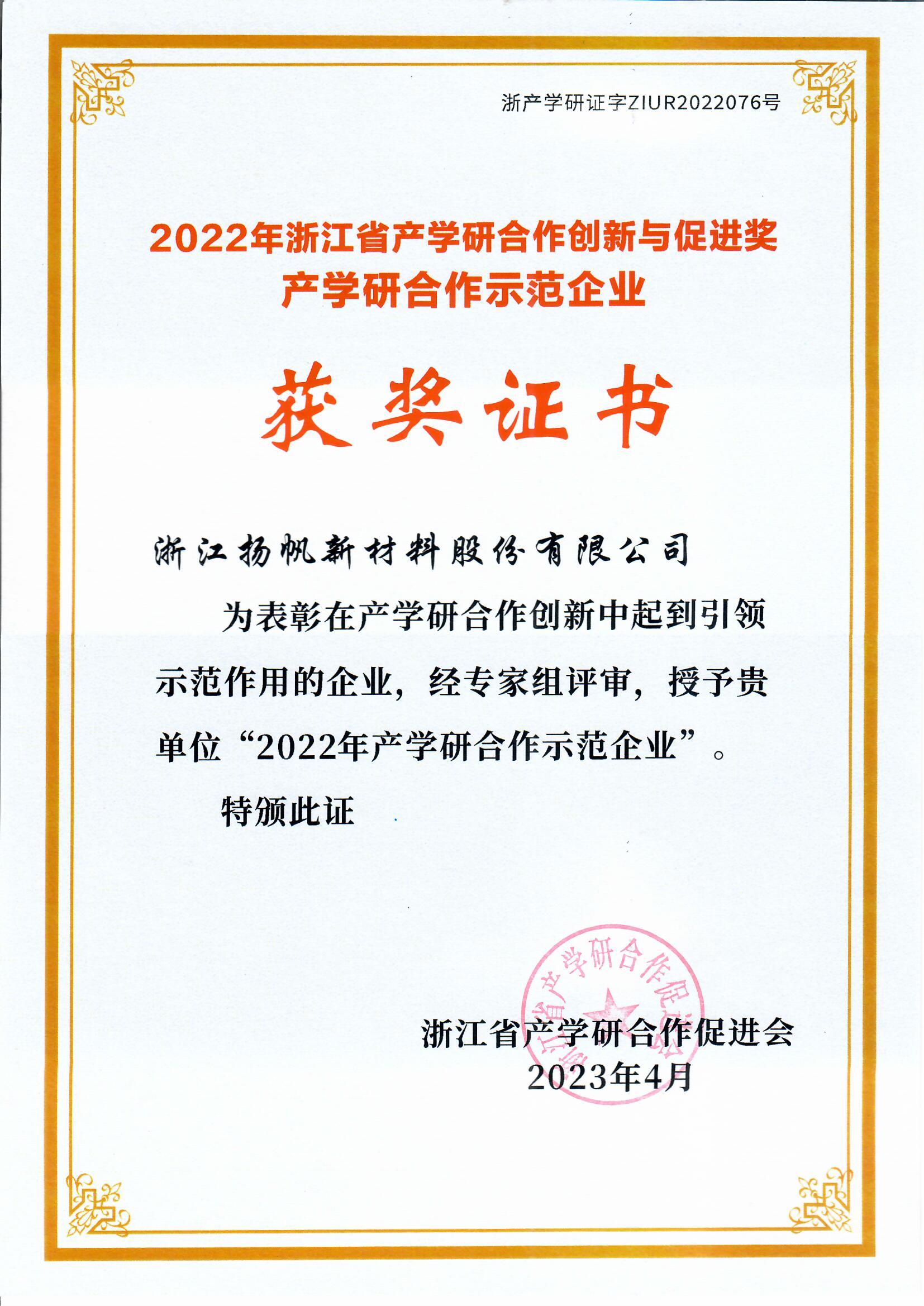 浙江杭州 『4月16日』揚(yáng)帆新材榮獲“2022年浙江省產(chǎn)學(xué)研合作創(chuàng)新與促進(jìn)獎(jiǎng) 產(chǎn)學(xué)研合作示范企業(yè)”