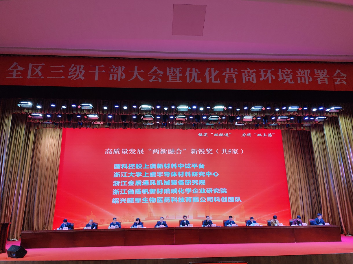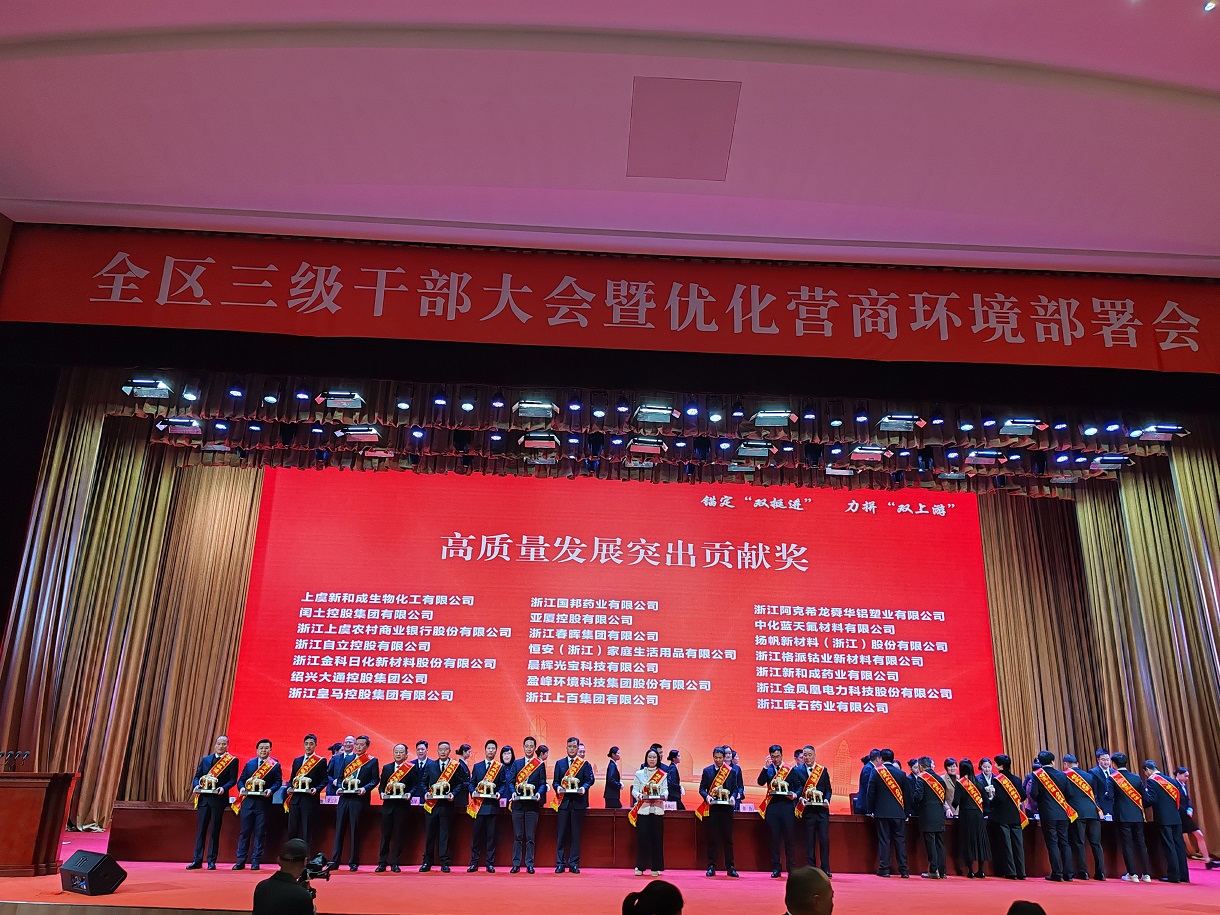 揚(yáng)帆新材料(浙江)股份有限公司樊彬董事長、陶明總裁參會并登臺領(lǐng)獎。公司憑借2025年優(yōu)異表現(xiàn),榮獲2025年度高質(zhì)量發(fā)展突出貢獻(xiàn)獎,樊彬董事長上臺受獎;同時,揚(yáng)帆新材下屬省級企業(yè)研究院斬獲高質(zhì)量發(fā)展“兩新融合”新銳獎,由陶明總裁登臺領(lǐng)獎。